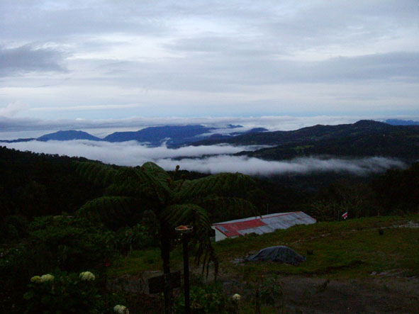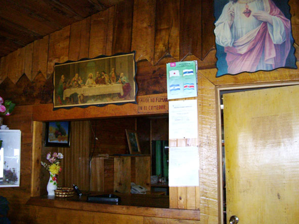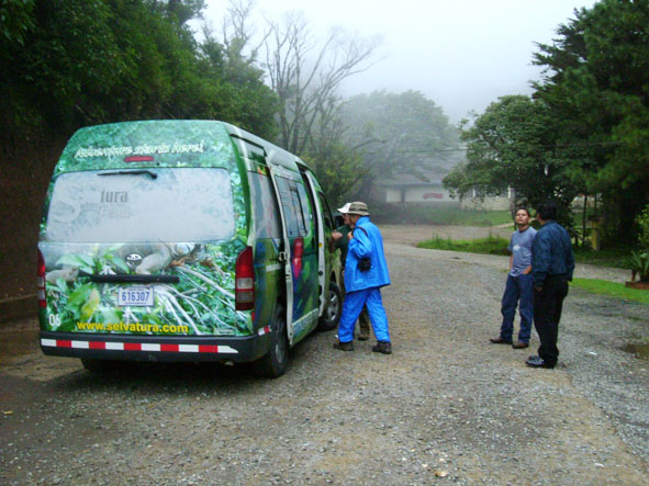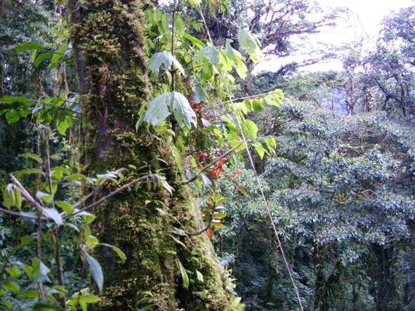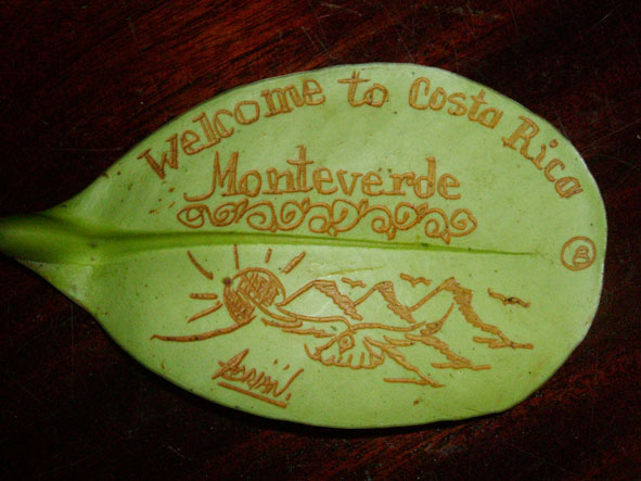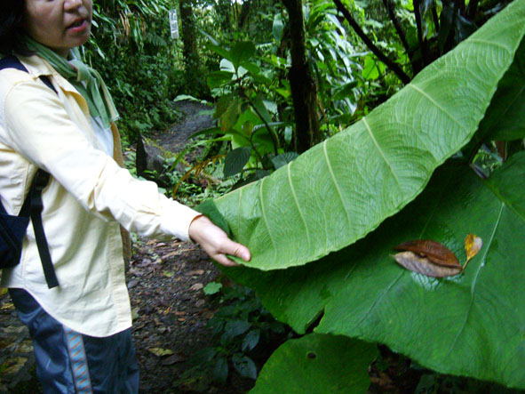 9月17日PUNTA MARENCO LODGEでの時間も残り少なくなった。Mさんは皮膚が炎症をおこしていたので、マロットさんに手当てをしてもらった。偶数羽状複葉の不思議な木。蚊に刺されて薬を塗ってもかゆみがとまらなかったので、葉をもんで塗ったら、かゆみが収まった。6時30分朝食で7時出発。7時45分〜8時45分。船にのる。途中ボタンウキクサ(サトイモの仲間)やホテイアオイが見える。船は前から3番目に乗ったら、衝撃が半減。小さい船に乗るときは、場所を選ばないと。H先生はスケッチをしながらメモをとっていた。木の高さもメモしていた。9時〜14時車で移動。運転手はオルヘさん。間に買い物と言ってもスーパーマーケットに寄ったり、観察タイムをしたりした。スーパーマーケットの店員は決しておつりをごまかしたり、しないそうだ。ドルで支払ってもおつりは、コロン。おつりを貰ってもおもちゃのように感じてしまう。コスタリカは道路工事が入ると片側通行になる。そこで観察タイム。表は白い花なのに裏はピンクフウロソウはガテマラフウロというそうだ。コケサンゴ?ウツボクザは日本と同じものだそうだ。標高2560mのフィンカ(牧場)・セラーノ(人の名前)に到着。標高が高く、寒く感じた。夜はストーブが燃えていて、ちょうど良い気温になった。14時45分から昼食。大皿に盛り付けてあり、自分で取る方式。環境オタクとしてはこの方がいいと思った。サラダ。コスタリカでは、イヌは放し飼いしか見なかった。どのイヌも知らない人間に近寄ったりしない。キリスト教の宗教色が強い室内。かわいい女の子おとぎの国のような一人だけ泊まれる小屋。バス、トイレつきだった。お湯が出るとのことだったが、日向水だった。今日は一人でこの小屋に泊まる。目覚ましを合わせて。15時40分から17時30分まで、オスカルさんの案内で熱帯雨霧林を歩く。樹齢800年の木々が夕闇の中で迫力を感じさせてくれる。1500種のランがあるとのこと。キノコ?コスタリカでは食料が豊富なので、キノコを食べるという習慣はないとのこと。小さな植物もあった。トクイッコは花はピンク、実が紫色でケッツァールが食べる。サンミゲラはピンクの花でジャムにするそうだ。シダの毛をハチドリは巣材にするそうだ。イゲーリシャ(グンネラ)はアカギレを直すらしい。大きな葉でザラザラしていて・・・足をこすってみればよかった。途中で観察して何だろうと思っていたので、使い方を聞き納得。オスカルさんは案内が終わると30分掛けて牛の乳絞りをしていた。最初に牛のうしろ足を紐で縛る。3匹のイヌが回りをとりかこんでいる。バケツいっぱいのミルク。それを少し地面にこぼす、イヌたちがそれをぺろぺとおいしそうになめる。残飯もイヌたちが食べていた。ここでは、捨てるものは少ないのもしれない。19時30分〜夕食。9月18日早朝散歩。ツバメが屋根に巣を作っているようにみえる。6時15分朝食。7時15分出発。途中最初に泊まったBALMORAL HOTELに立ち寄る。ここはコジツアーの社長でガイドのkaseさんの事務所もあるところ。昼間見ると素晴らしいホテルで驚く。ここでkAsEさんとKAWAharaさんと別れる。日本語で質問できなくなる・・・さみしい。途中の車窓からサンホセの街。落書き通り日本の会社の看板も見えた。途中道に迷い心配。運転手はスペイン語だけ・・・sさんの説明がやっと通じ・・・。やっとVILLA VERDEに到着。今回コスタリカに2回来たSさんとNさんがいてよかった。ほっ。ホテルはとても整備されていた。モンテベルデ自然保護区メモコスタリカの北西部に広がる熱帯雲霧林地帯に位置するモンテベルデ自然保護区はコスタリカを代表するエコツアーの人気地区。ジャガーは絶滅危惧。2500種の植物が生育している。420種のランがある。ここは国立公園ではなく民間のナショナルトラストである熱帯科学研究所が管理する自然保護区である。面積は1万5000ha。13時着。昼食後モンテベルデ自然保護区へ。ガイドのアドリアさんが迎えに来ていた。ナナフシはウオーキングスティクと早速説明してもらう。14時10分車に乗る。14時42分着。熱帯雲霧林(クラウドフレスト)をスカイウォークで歩く。森の木々が豊かに葉が茂っているので高いところを歩いている感覚はなかった。アドリアンさんが高いところに登って撮影してくれた。5000種のアフリカンバイオレット(イワタバコ科)コーヒーの仲間がある。木々は苔で覆われていて①寄生②半寄生③着生の3タイプがある。グリーンハーメット(ハチドリ)は色がきれいだった。ダイヤモンドシーズ(ダイヤモンドの木)の実は固かった。ラバーズリップ(おしゃぶりの木)なるほど・・・名前が納得できた。スカイウォークではアドリアさんが高いところから写真を撮ってくれた。ガイドは体力も必要。葉に絵も描いてくれた。皆に好きな番号を言って貰い当たった人にプレゼント。Nさんが当たったものを撮影した。17時15分まで案内してもらい、カエルの博物館へ。入場料き10ドル。17時50分〜18