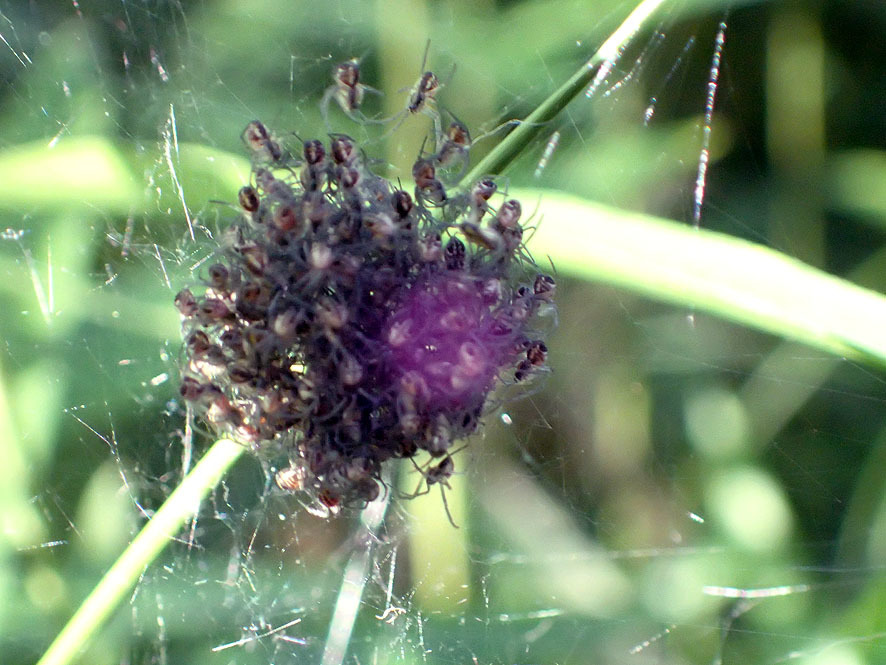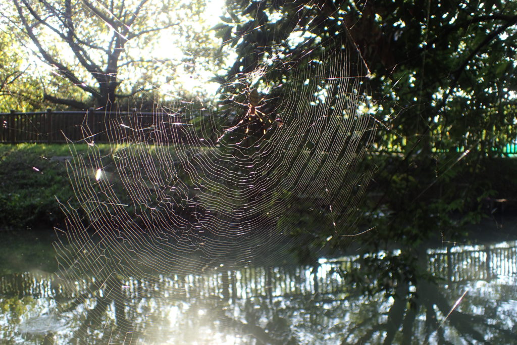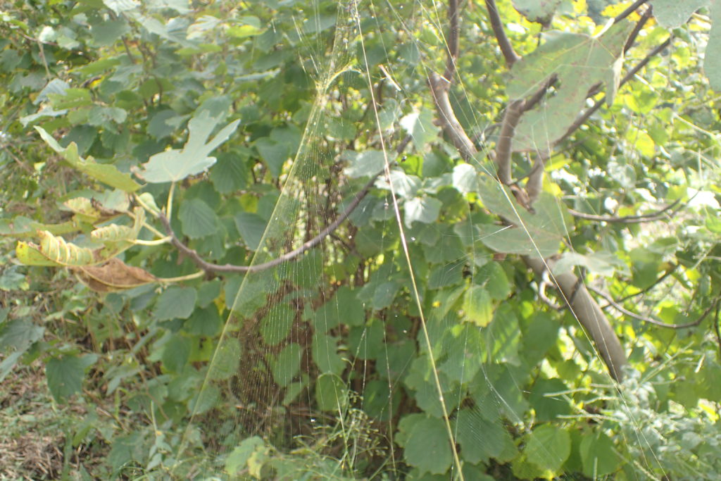 春から夏にかけては網は白色。秋に成熟する頃になると黄金色に輝く。黄金化の理由は秋になり環境が紅葉化するための保護色と考えられると書いてある本もある。産卵近くなると金色の糸が見られるようになると書いてある本もある。メスは9月に成熟。オスはメスより早く成熟し亜成体の網に同居し、メスの最終脱皮直後に求愛・交尾する。交尾後オスは新たなメスを探す。卵で越冬。参考:「クモ基本60」東京蜘蛛談話会「日本のクモ」文一総合出版 (写真:加倉井範子)