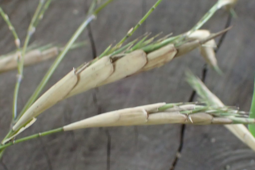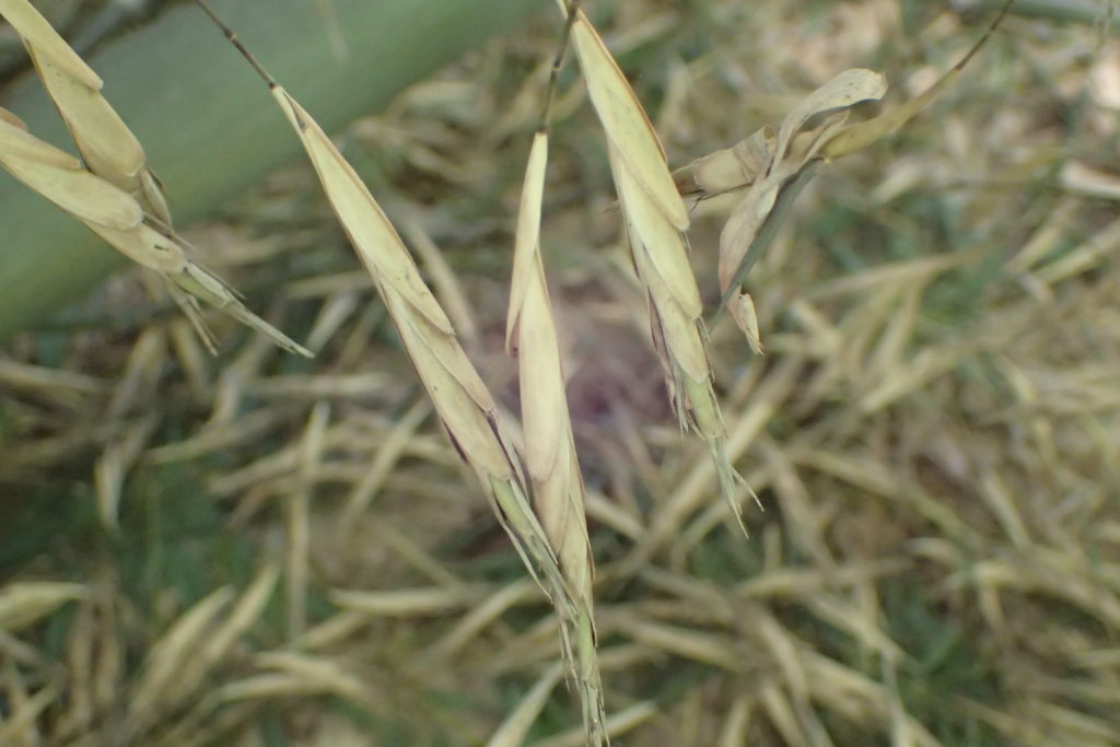 2021年8月21日定例活動日。モウソウチクに花らしきものが・・・。竹林内草刈り、公道側の不要な竹10数本伐採。用水沿いヤブマオ水路にかかったもの取り除く、ヤホルの水路外来種抜き。見学者2名、来訪、梶間さん対応。