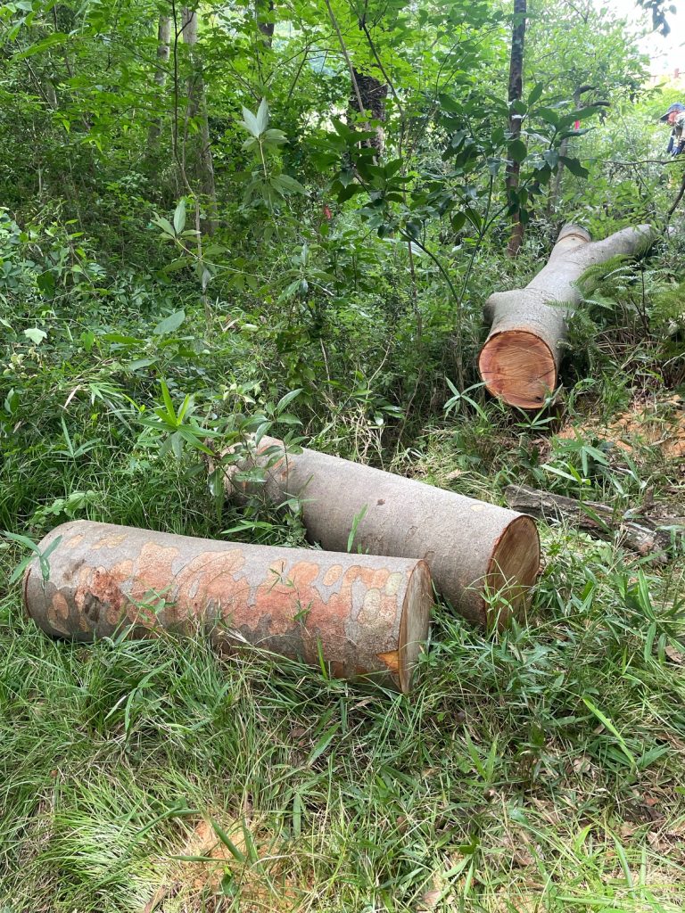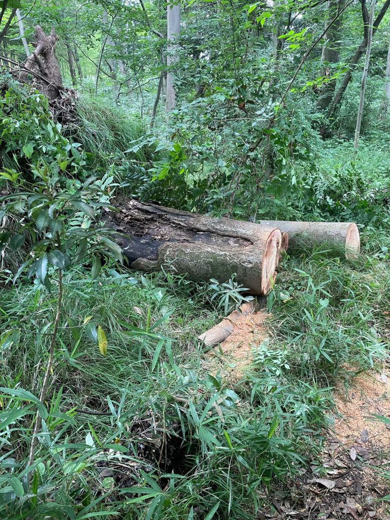 ⬜︎作業 ①上の通路・斜面の枯枝を整理、平地に移した ②倒木の処理(通路の確保、用水への落下防止、玉切り)③草刈り(通路・竹林・P)④林(切った木を片付け)