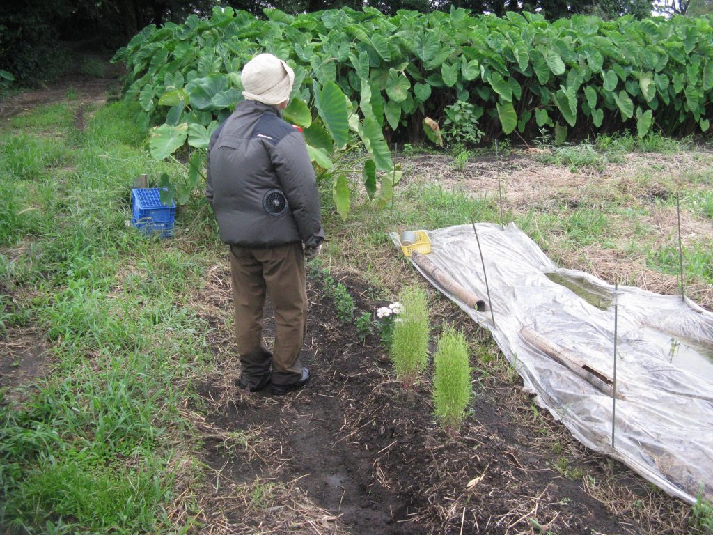 いつも早くから畑に来ている平井さん。作物もとても工夫して育てています。朝早く来ていると藪蚊に悩まされるそうですが、トンボの援軍が藪蚊を食べてくれ、とても感謝したそうです。そのことを歌にしたそうです。「暁に 藪蚊を蹴散らす トンボかな」