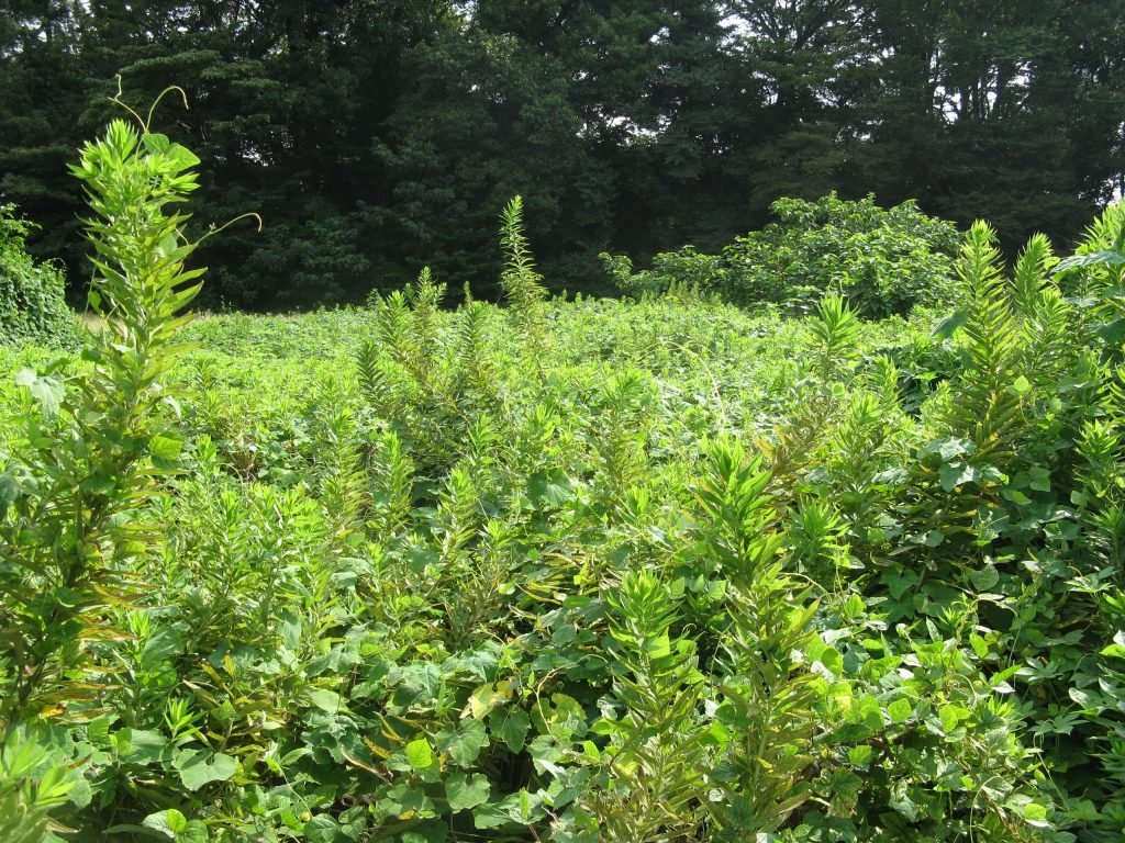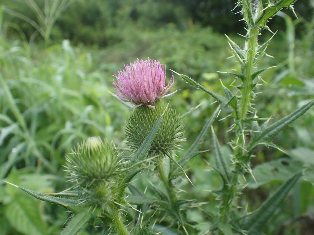 ⬜︎作業 果樹園の草刈りとヘーベルナッツの草防止 防草シートは結局、草に覆われてしまい、剥がすのが大変です。しばらく手入れをしていなかったので、アメリカオニアザミが生えていました。実験でヘーゼルナッツの周りに段ボールを敷いてみました。
