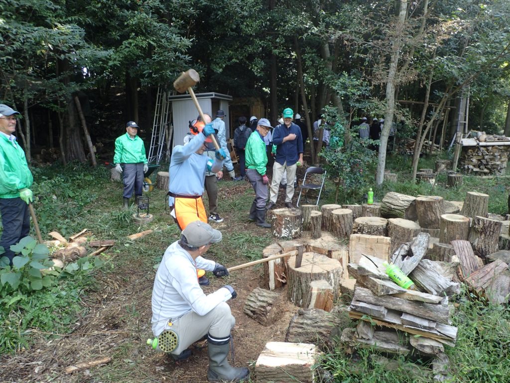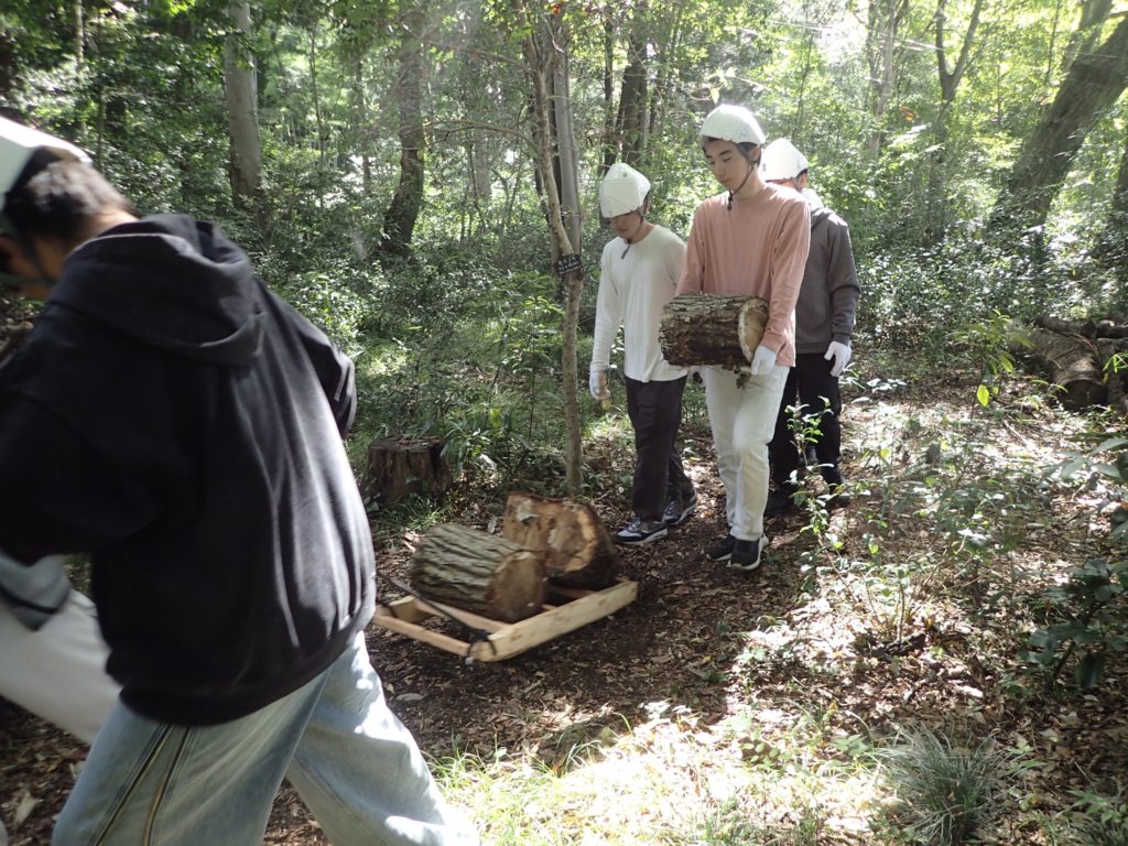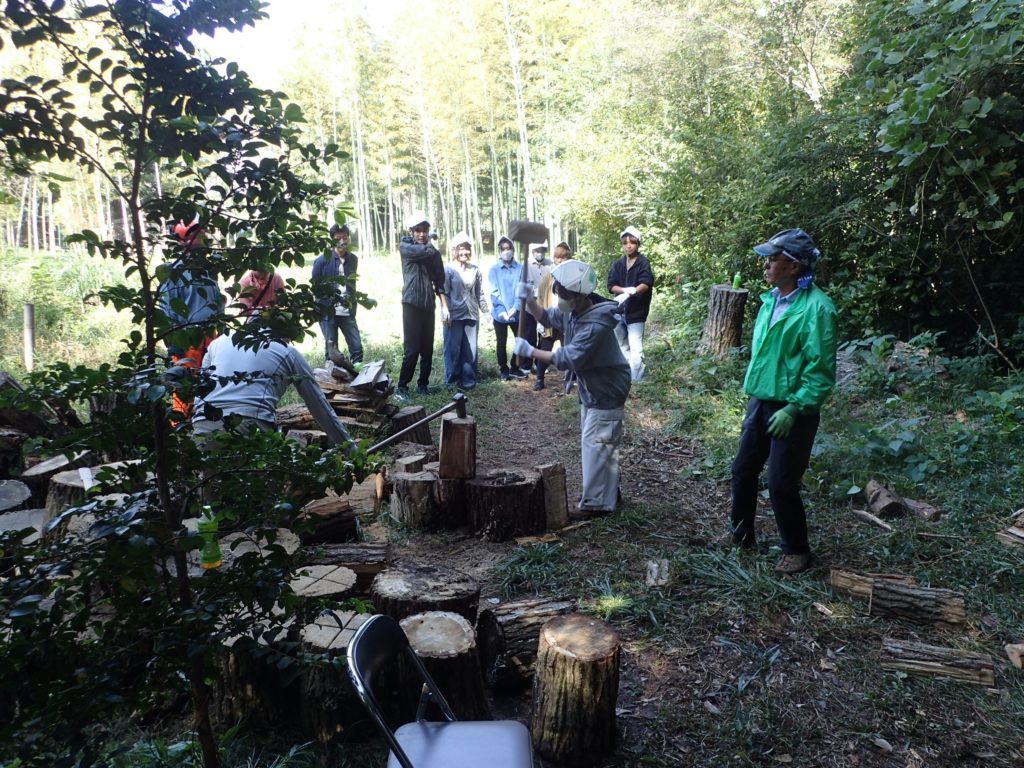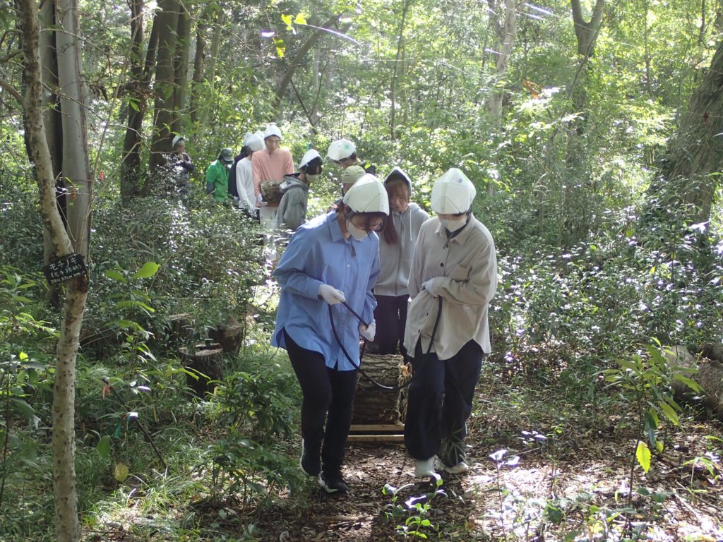 □作業 2班に分かれて作業 ①自然観察をしながら移動→ケチヂミザサ抜き+草刈り ②丸太運び+薪割り