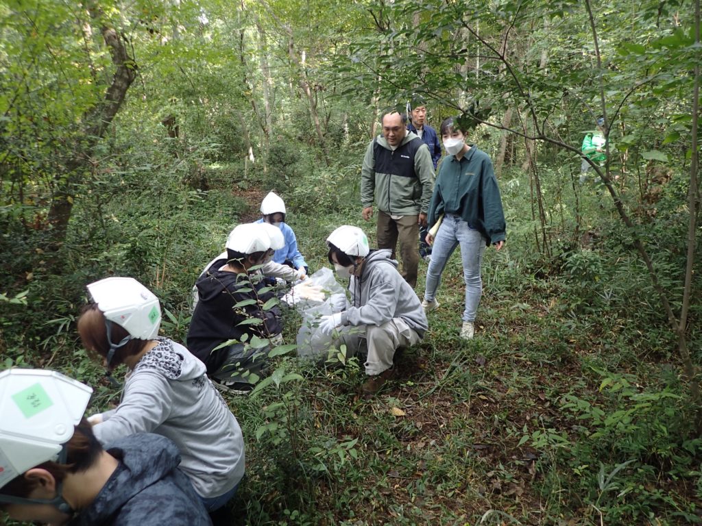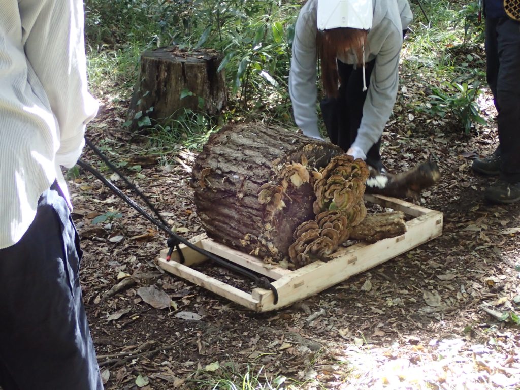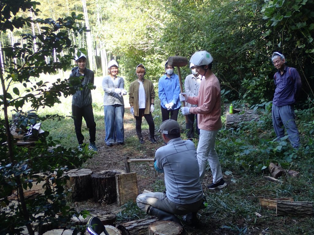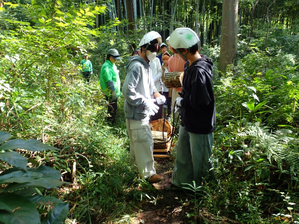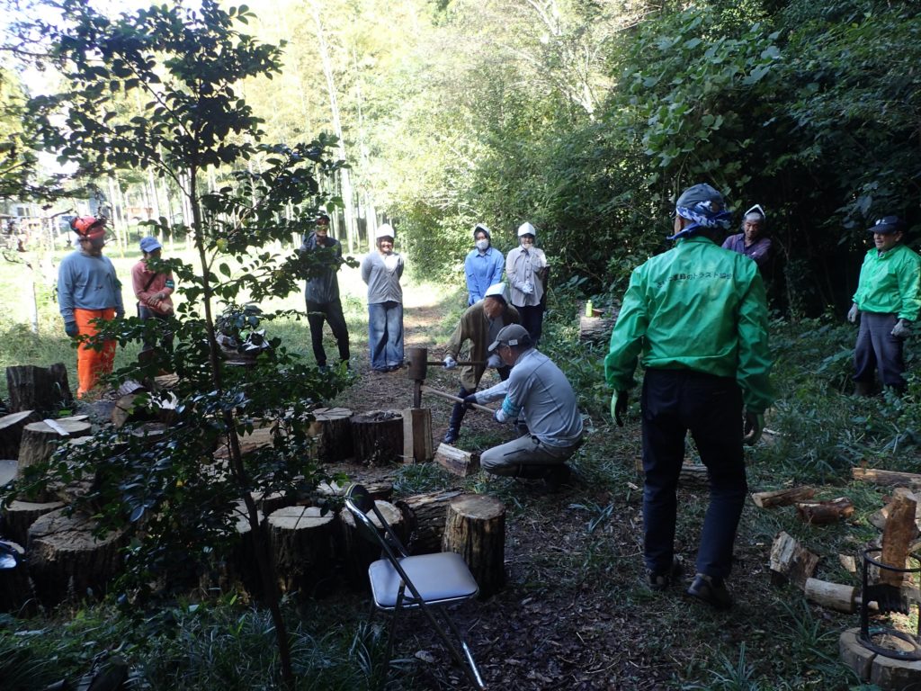 □作業 2班に分かれて作業 ①自然観察をしながら移動→ケチヂミザサ抜き+草刈り ②丸太運び+薪割り