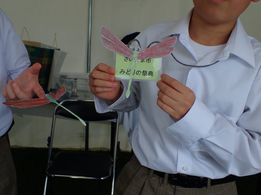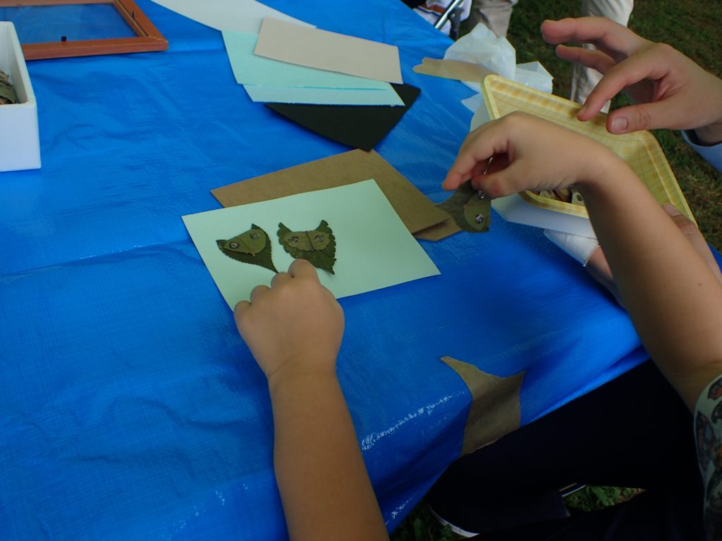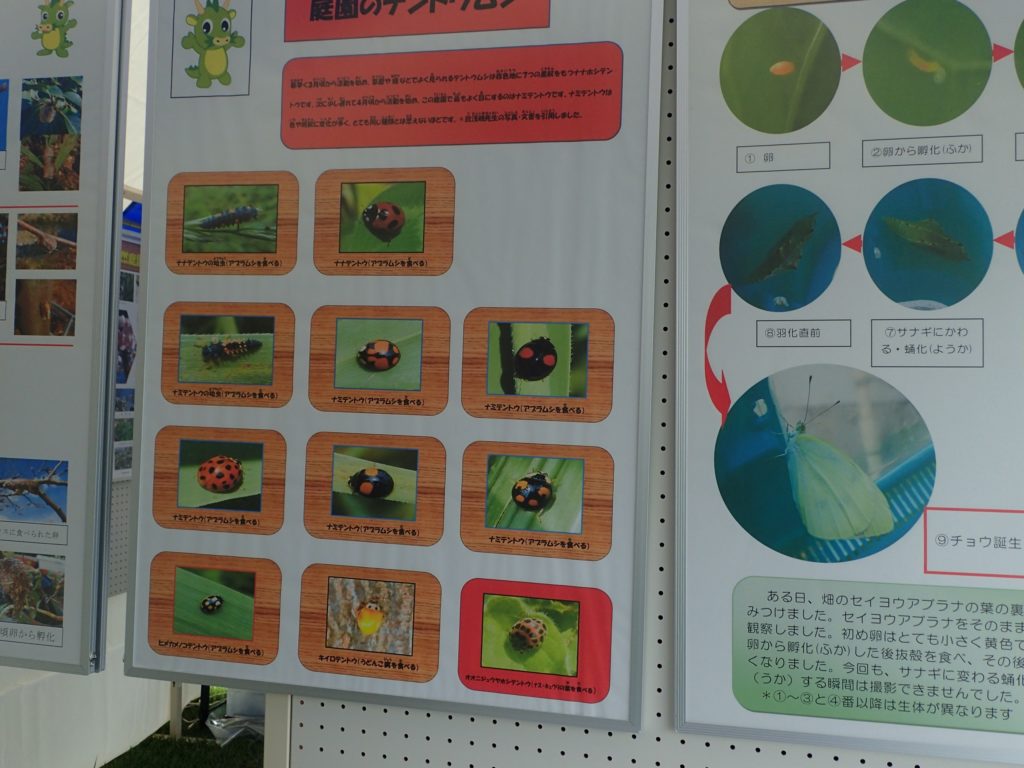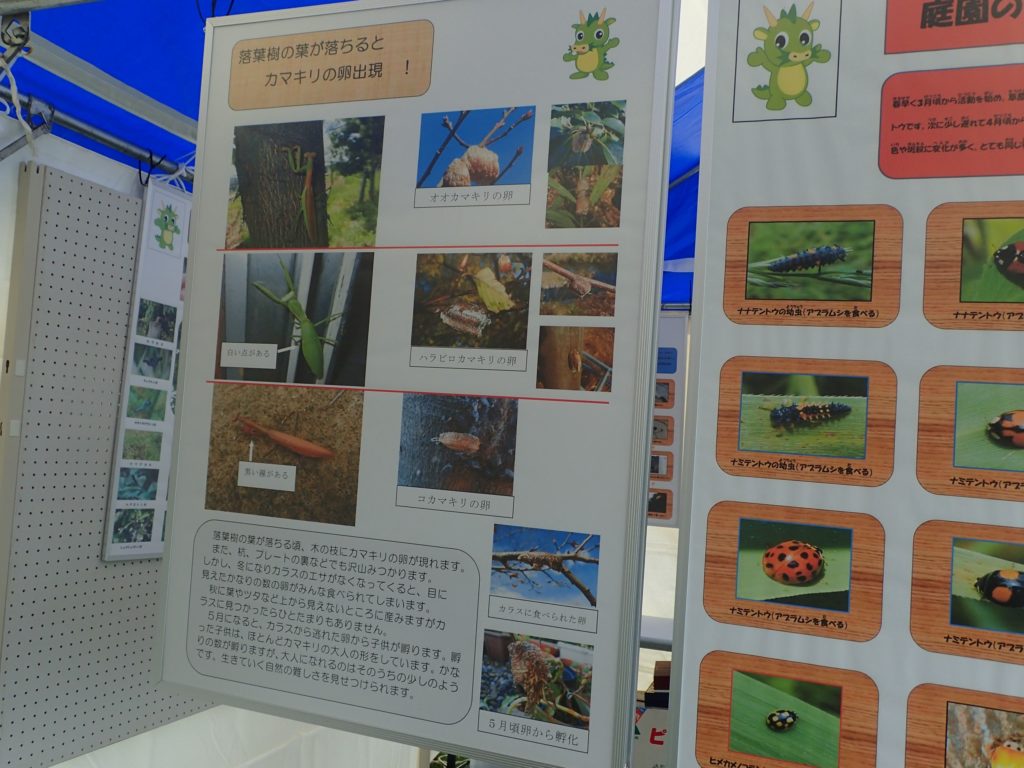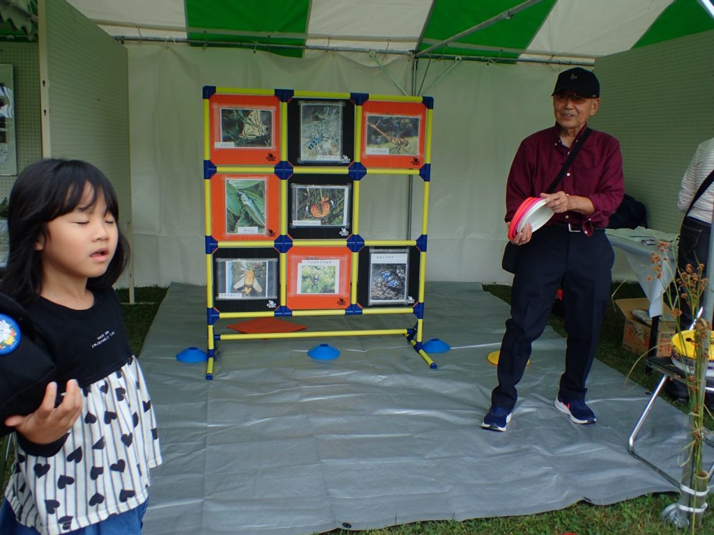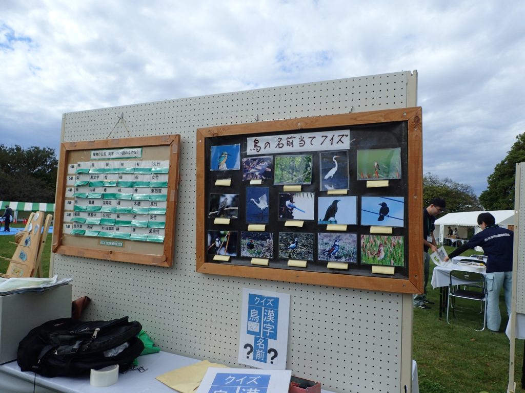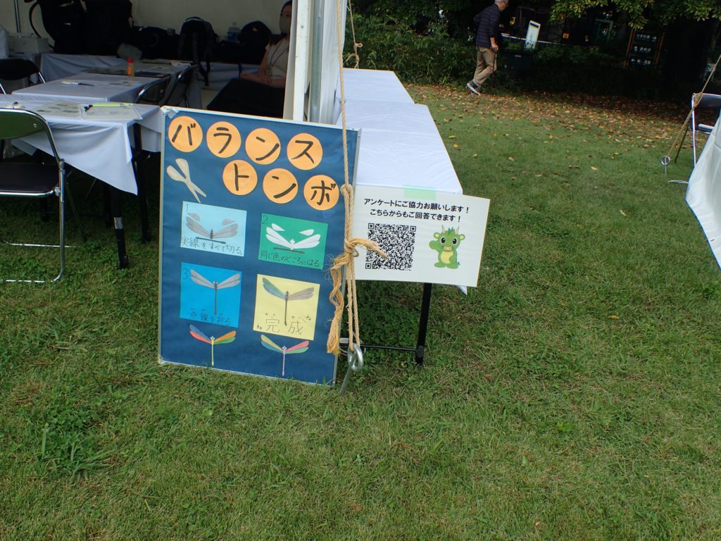□出し物 号地紹介 漢字当てクイズ 鳥の名前当てクイズ バランストンボ 生態系輪投げ ガリガリトンボ メモフォルダー 木ゴマ パタパタ 実体顕微鏡 イラストを描いてボランティアをしよう(46作品が集まりました♫)