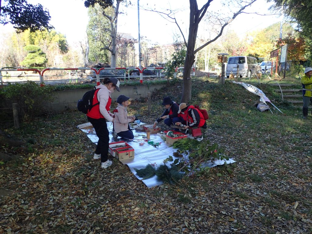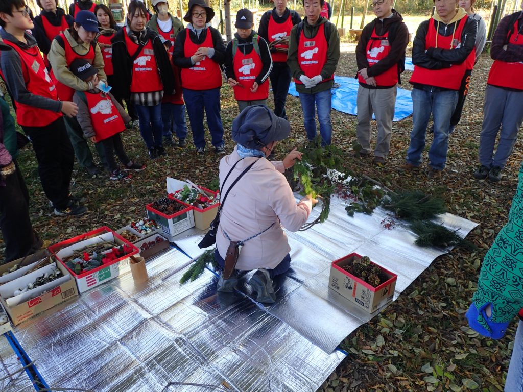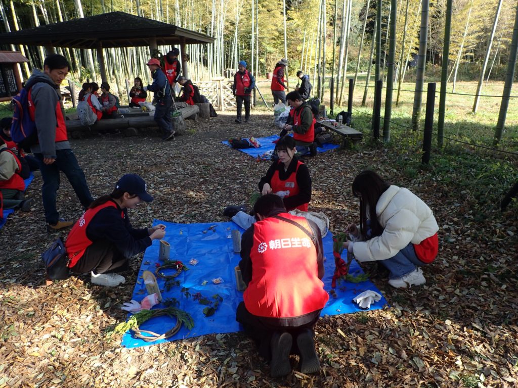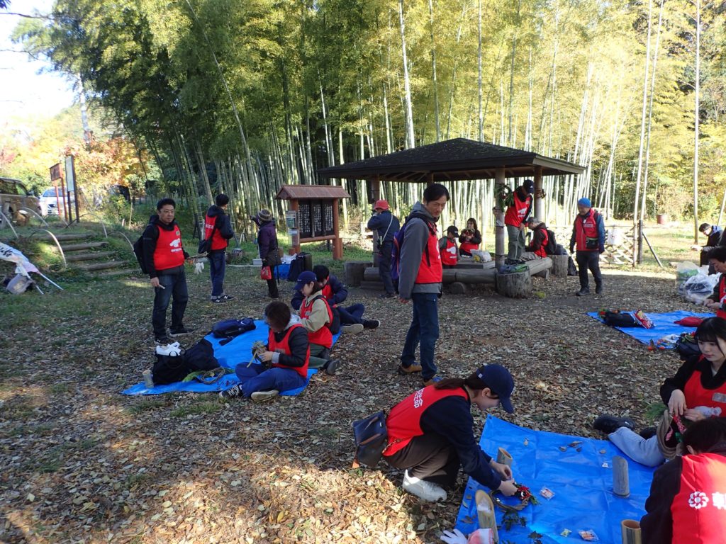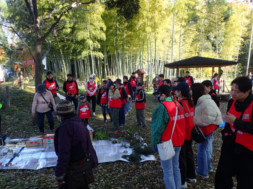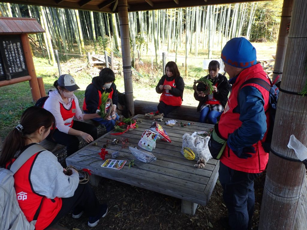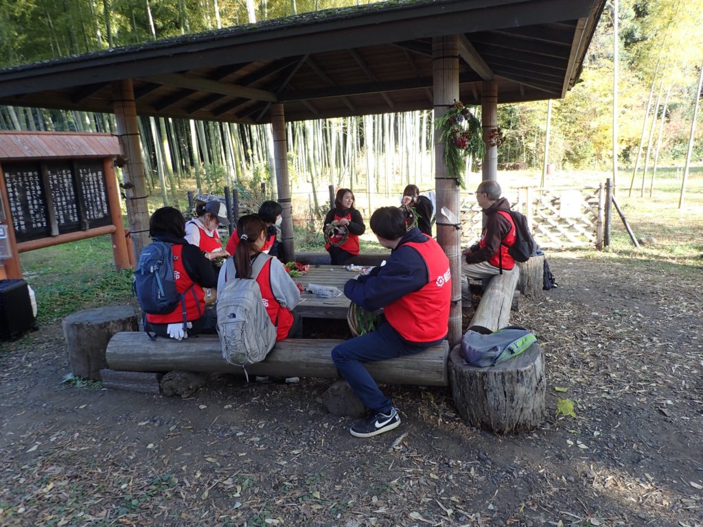 リース作り(みんなの広場)12:00 昼食(トラスト東屋)13:00 リース飾り付け+竹割り体験&竹の鉛筆立てづくり 14:20 片付け 14:40 集合写真撮影 14:45 閉会